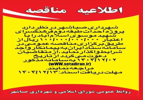👈اطلاعیه مناقصه 🔶شهرداری صباشهردرنظر دارد پروژه احداث طبقه دوم فرهنگسرای شهید موسوی اسلام آباد را با اعتبار۱۰۰/۰۰۰/۰۰۰/۰۰۰ریال از طریق برگزاری مناقصه عمومی در سامانه ستاد ایران به پیمانکار واجد شرایط…